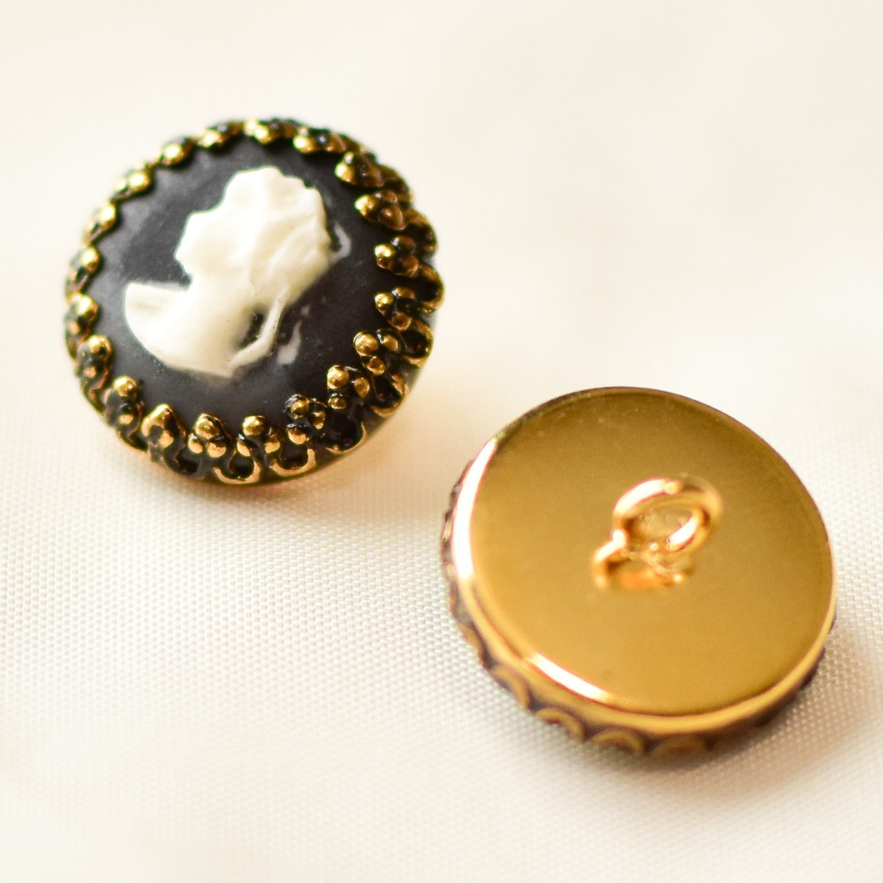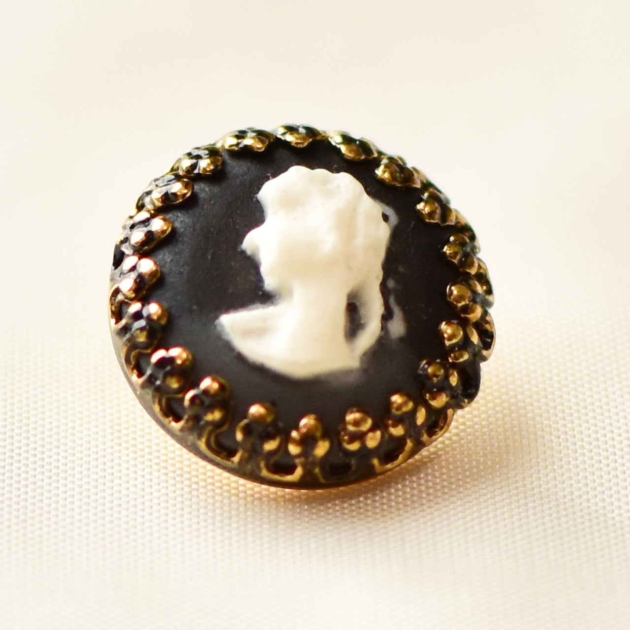 素材は真鍮製、カメオ風の箇所は樹脂です。