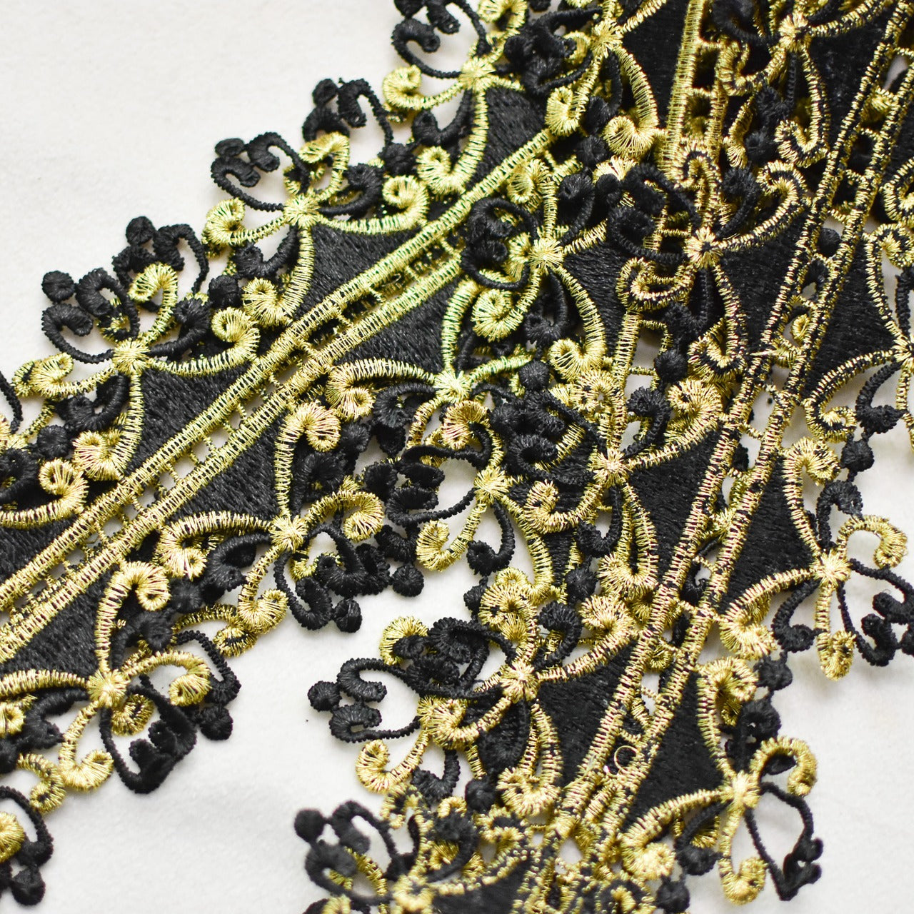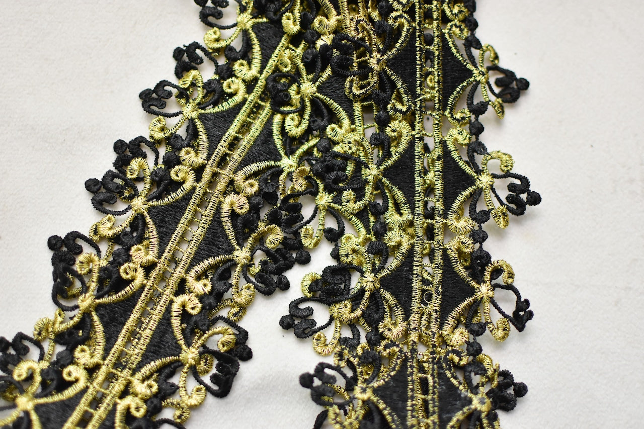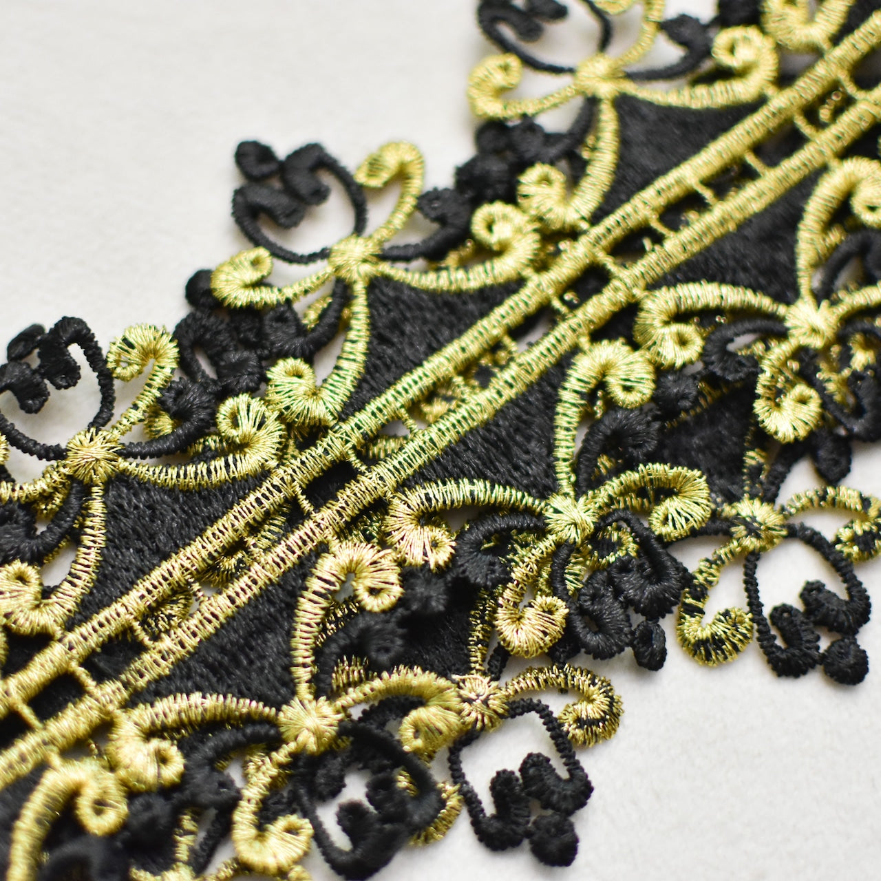 ブラックのベースにゴールドの刺繍が美しく映える、インパクト大の刺繍リボンです。細部まで立体的に仕上げられた模様はまるでレースのよう。ドレスアップや衣装制作、アクセサリー、ハンドメイド作品の装飾にぴったりです。