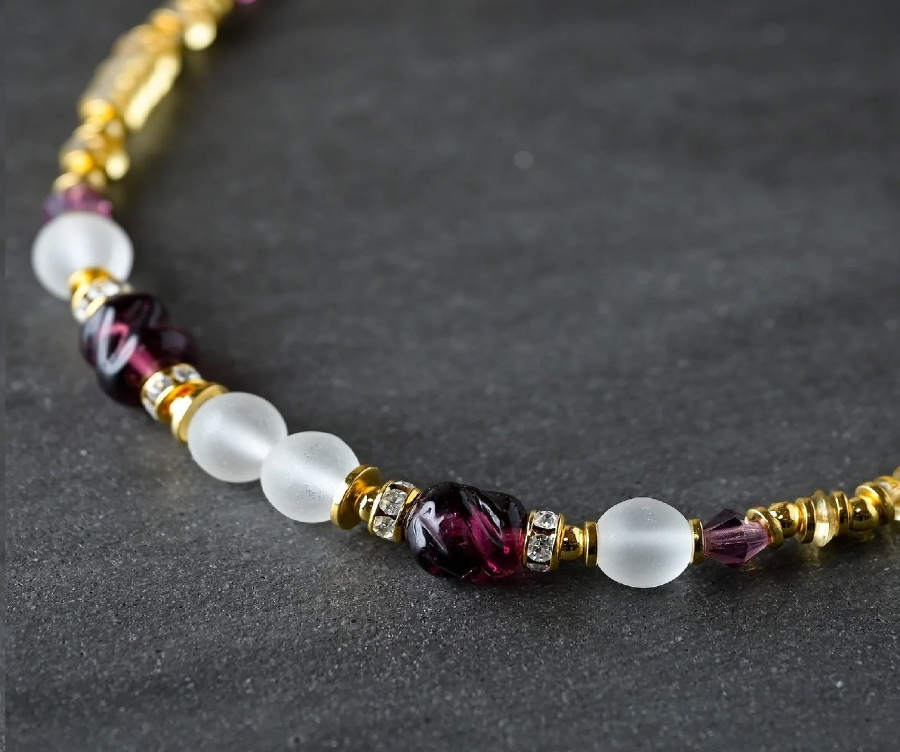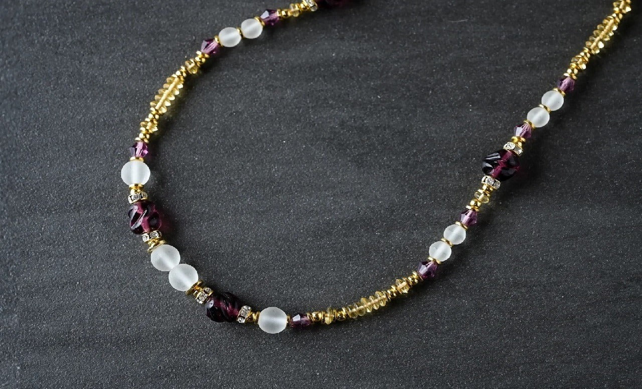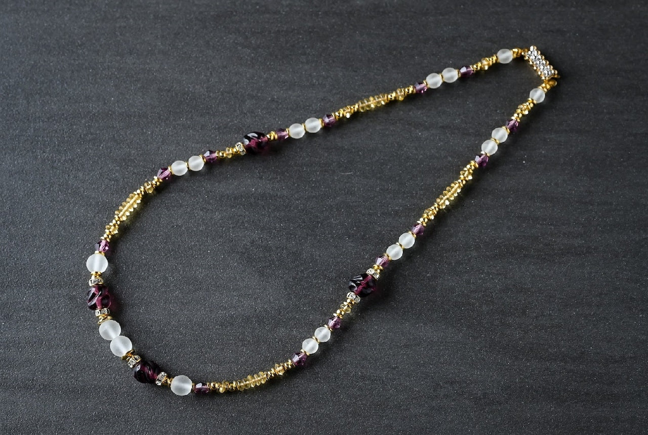 アメジスト色のビーズとくもりガラスのビーズのネックレスです。