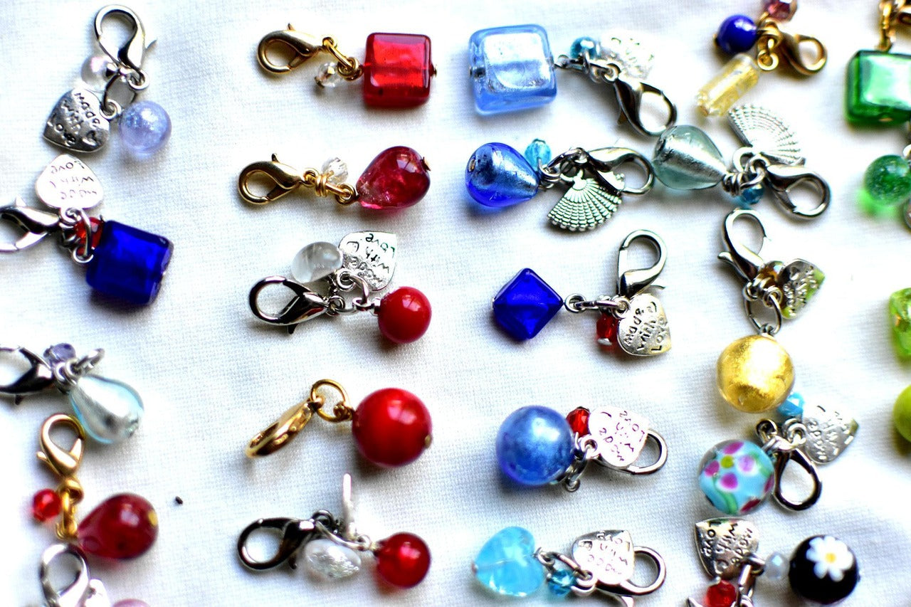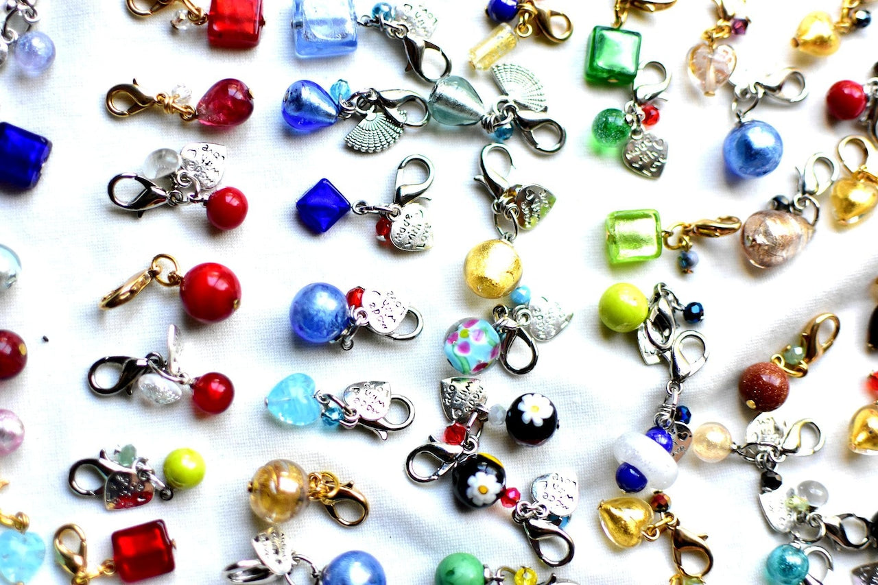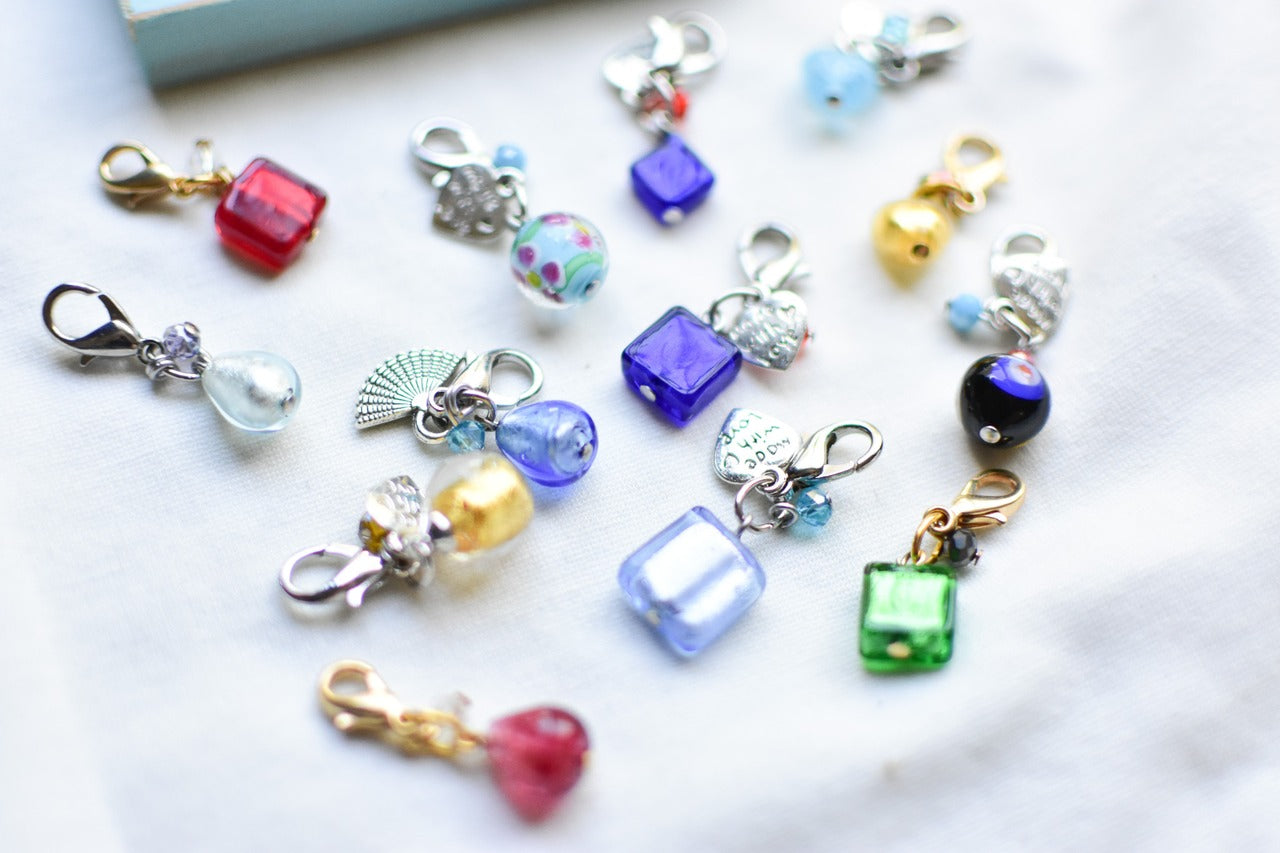 色の系統(ブルー系、レッド系など)やお好みの形(丸・四角・ハートなど)をお知らせいただくと、より参考にさせていただけます。どのチャームも職人の思いが込められた特別な一品です。