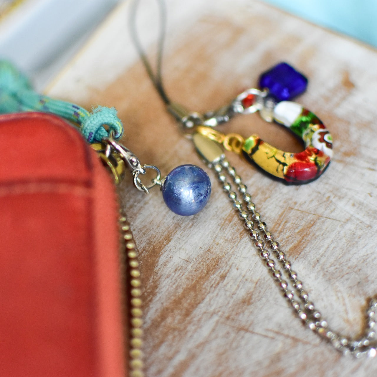 一つ一つ手作業で生み出されるガラスには、職人の魂と情熱が宿ります。鮮やかな赤、深い青、透き通る水色、優しい緑...それぞれが異なる表情を持ち、太陽の光を受けると息をのむほどの美しさを放ちます。丸やハート、四角などさまざまな形のチャームには、「Made with Love」の小さなメタルプレートや貝殻モチーフが添えられ、一つひとつに物語が込められています。