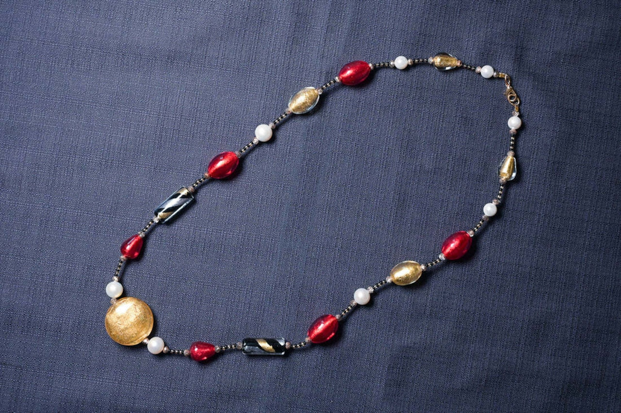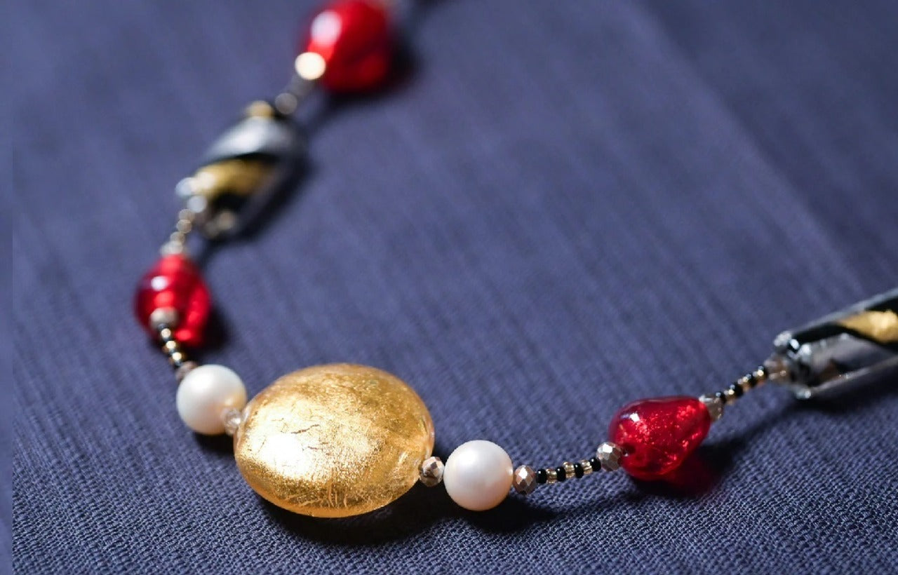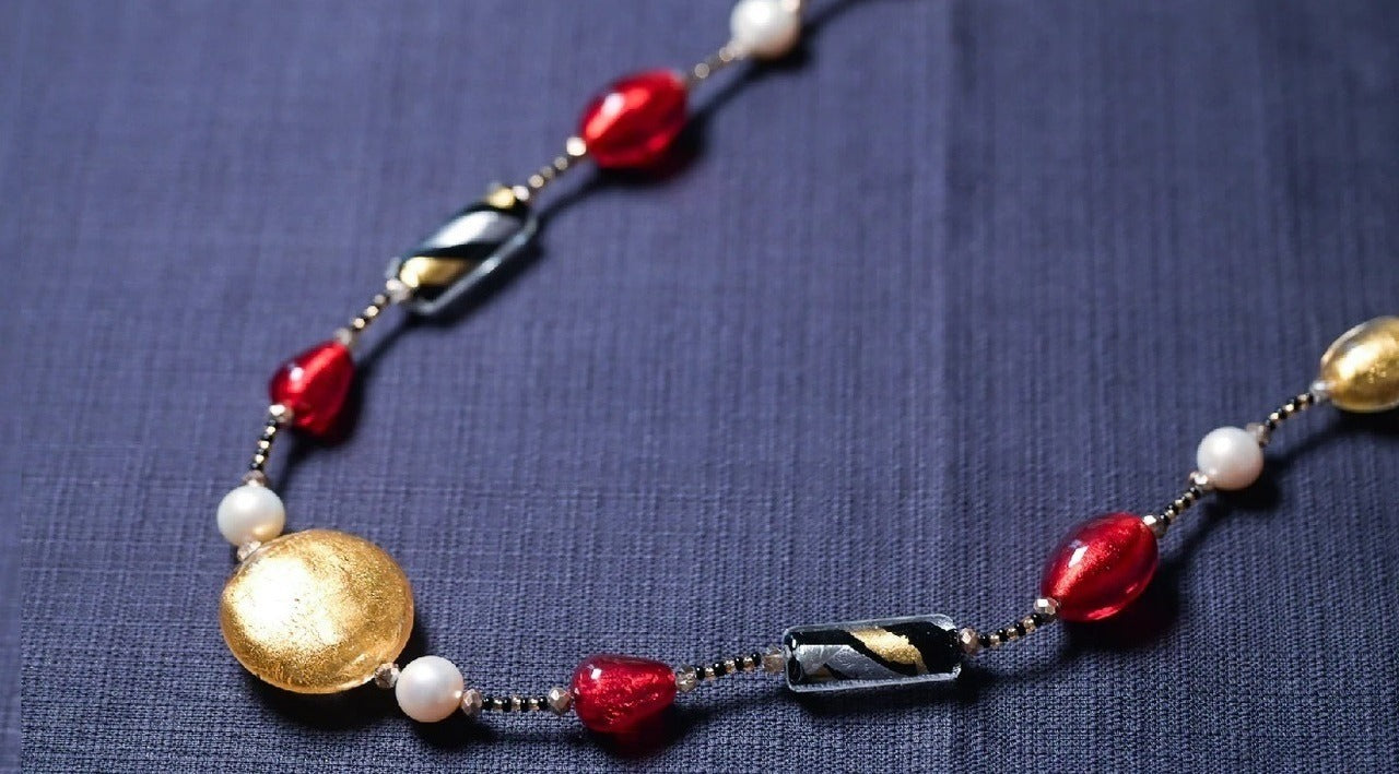 中央のゴールド色のビーズが美しいベネチアンガラスのネックレスです。キラキラが目に入るとテンションが上がります。