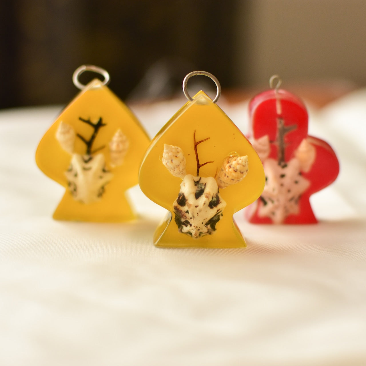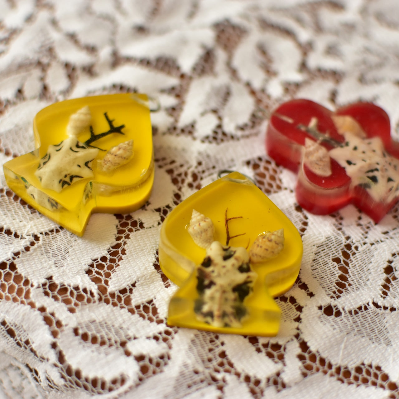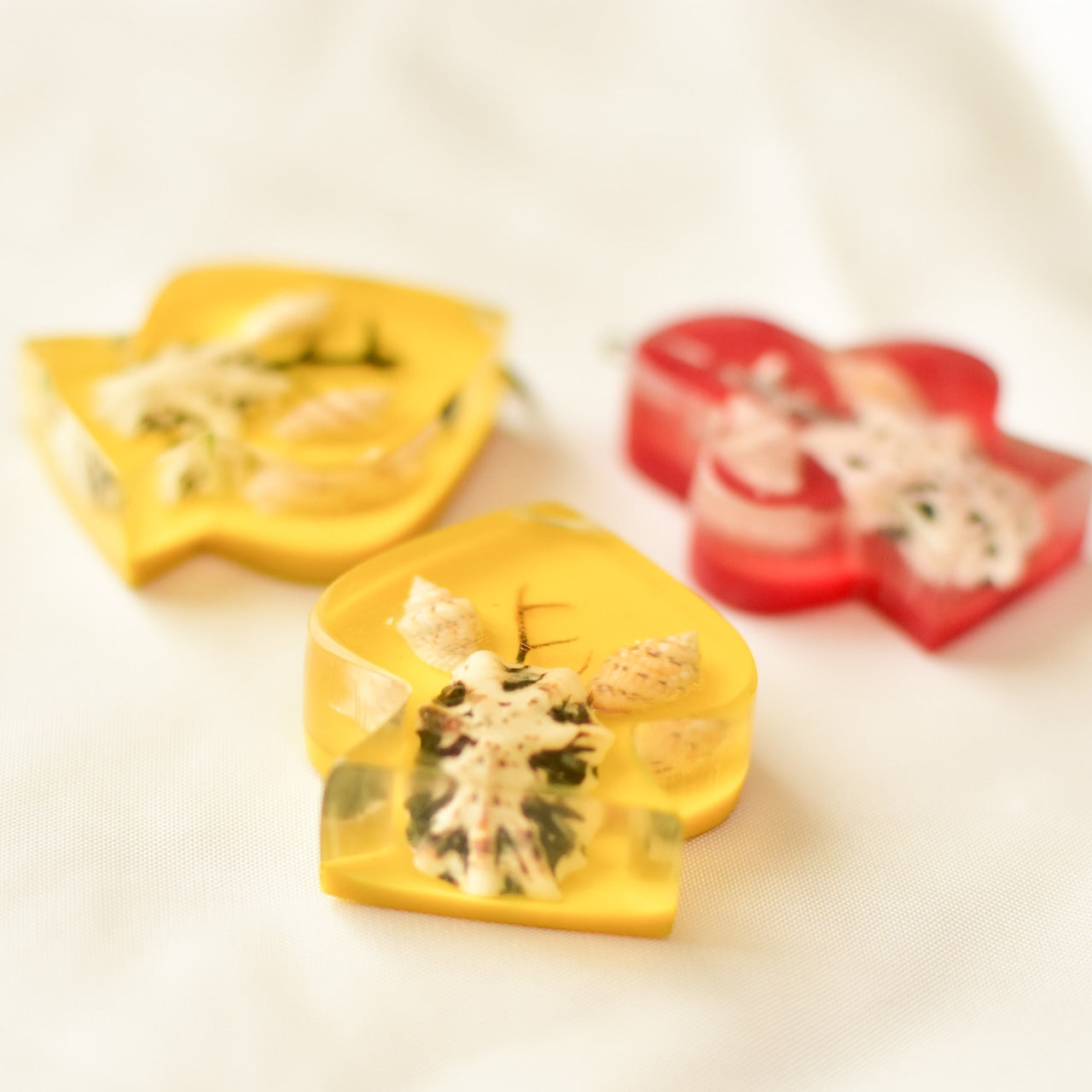 アールデコを表現したかったのか・・左右対称なモチーフが樹脂の中に入っています。とはいえ自然の貝などを入れているため左右対称にはならずに自由な形なところがとても面白いと個人的には思っています。